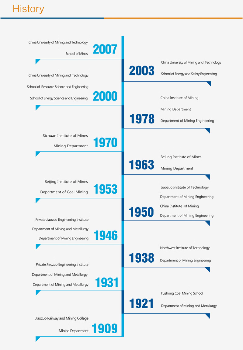 The School of Mines traces its origin to the Mining Department of the Jiaozuo School of Railroad and Mines founded in 1909. The Department of Mining and Metallurgy was formally established in 1933. After a nationwide readjustment of higher-education institutions in 1952, the Mining Engineering Departments of such universities as Tsinghua University, Beiyang University (the predecessor of Tianjin University), and Tangshan Chiao Tung University (the predecessor of Southwest Jiaotong University). The Department underwent several name changes, including the Mining & Metallurgy Engineering Department, Mining Engineering Department, Coal Mining Department, and Mining (Engineering) Department. The Department was upgraded to the School of Energy Science and Engineering in 2000, and renamed as the School of Energy and Safety Engineering in 2004 and, finally and officially, as School of Mines in 2007. Born to comply with the rise of the coal industry, the School has been thrived with the industry’s prosperity, making a remarkable contribution in talent cultivation and scientific advance to the nation’s coal industry.