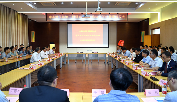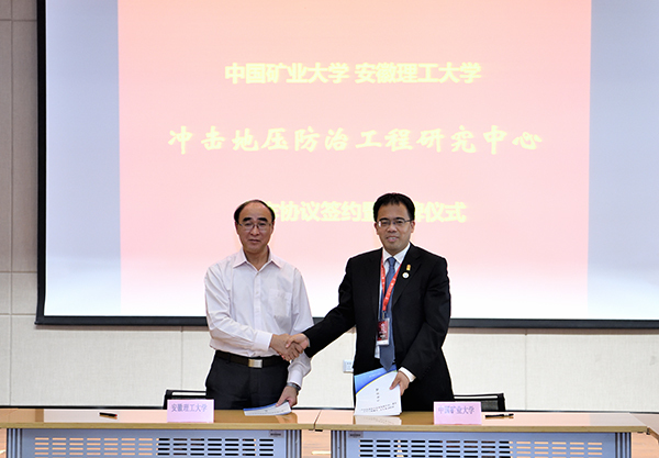刘波书记、袁亮校长一同为研究中心揭牌。周福宝副校长和郑明东副校长分别代表中国矿业大学和安徽理工大学共同签订《共建冲击地压防治工程研究中心合作协议》。