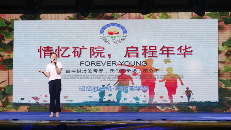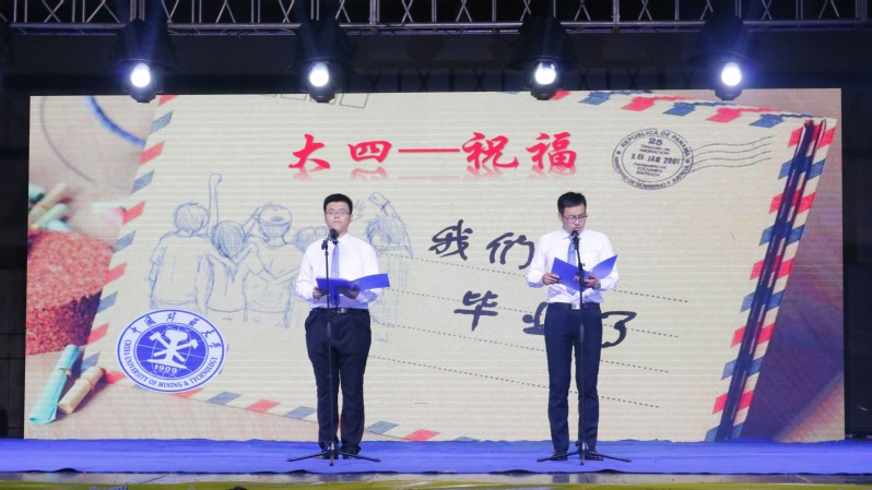 晚会最后,大屏幕上播放了由2019届毕业生共同录制的VCR,记录了同学们大学四年生活的点点滴滴,晚会气氛被推向高潮。由15级辅导员李同欢老师和毕业生代表武兆鹏同学带来的诗朗诵《毕业赞歌·师生颂》温情脉脉,扣人心弦,引发大家重温有关食堂、镜湖、图书馆等的矿大记忆,将毕业生带回他们的已逝时光。原15级辅导员李居铭老师的独唱《宁夏》,轻快明朗,温暖如风,表达了对毕业生们此去前程的美好祝愿。晚会在萨克斯独奏《约定》的婉转旋律中圆满落下帷幕。
